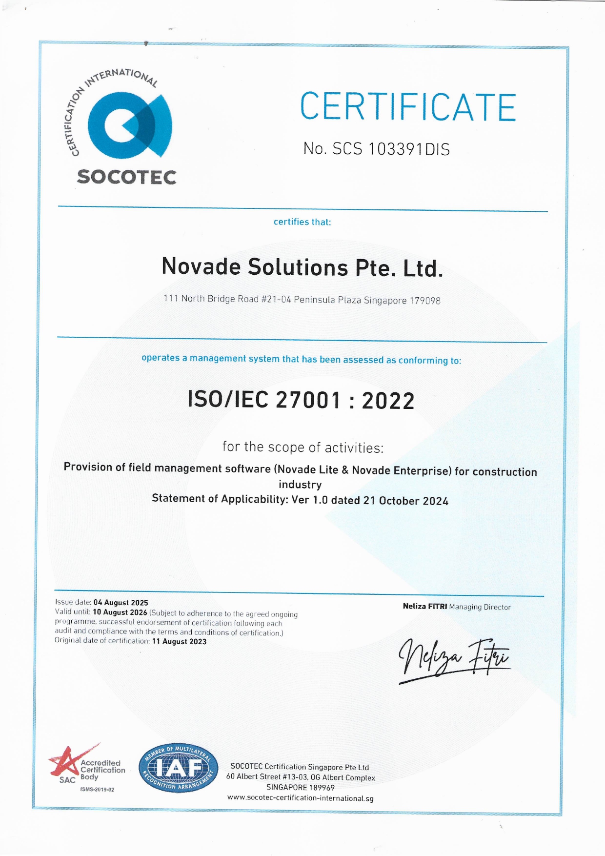 - Pursue government contracts: The ISO 27001 certification positions Novade Solutions as an eligible contender for government contracts that prioritise robust information security practices, expanding our opportunities to serve and collaborate with public-sector entities.