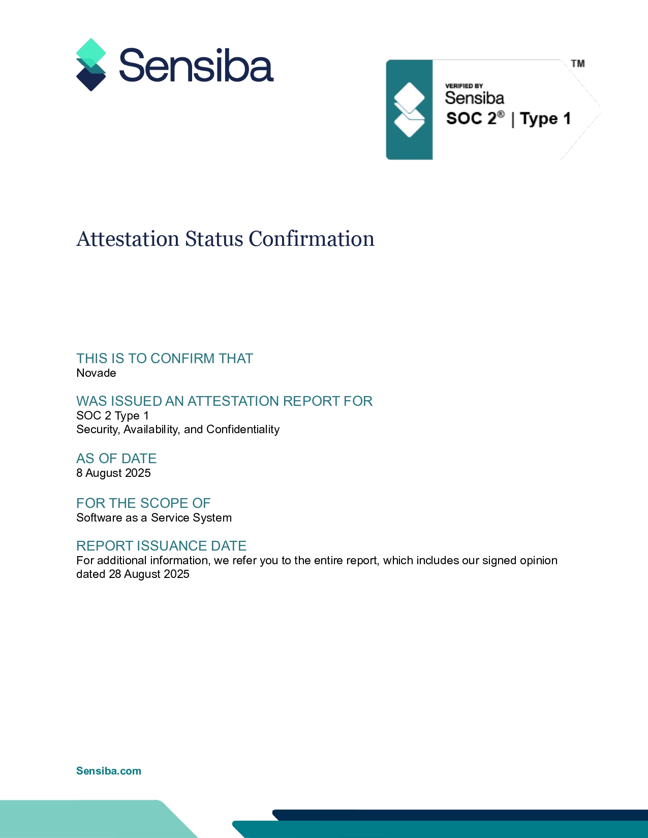 Novade Solutions has successfully completed a SOC 2 Type 1 audit and received an independent attestation report, demonstrating our commitment to safeguarding client data and maintaining the highest standards of security, availability, and confidentiality.